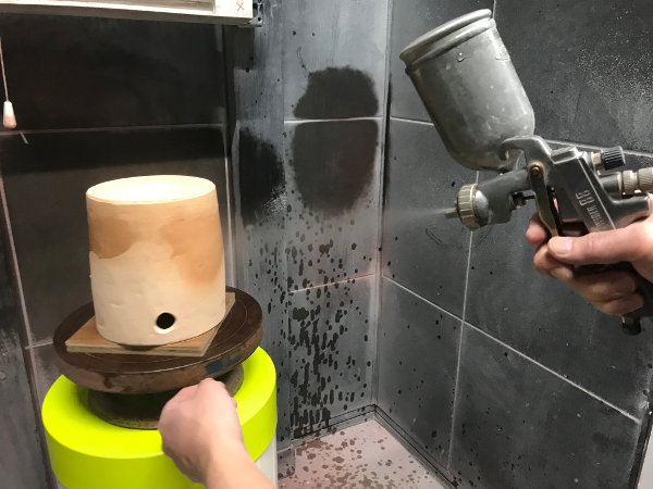 土を電動ロクロで回転させて成形します。
